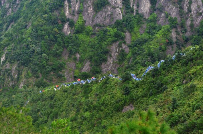 在整個行軍過程中,最有挑戰的路段莫過于三十六彎了,有些地方臺階的陡峭度甚至達到了六七十度,每跨上去一級,大腿就會又酸又疼,在互相鼓勵下,天信隊員們不放棄不拋棄,一步步堅持到底,終于站在了最高峰俯視群山,當美景盡收眼底的那一刻,大家紛紛拿出手機記錄下這個難忘的旅程,并在微信、微博搶發,一瞬間朋友圈被紅色正能量刷得滿滿的!